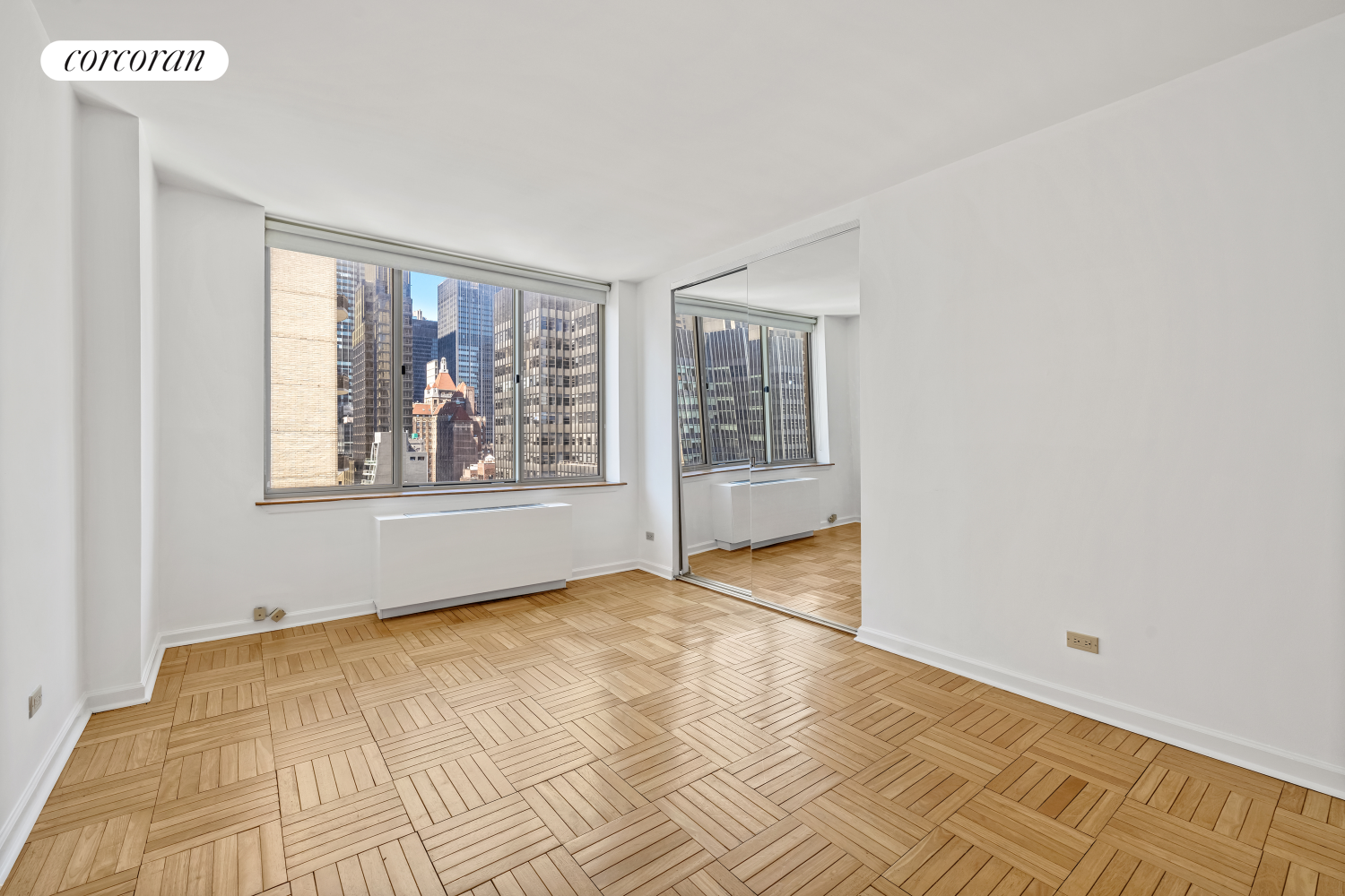 This high-floor corner two-bedroom, two-bathroom residence at The Club at Turtle Bay features a thoughtful split layout with open north and west exposures, offering sweeping city views and abundant natural light throughout. The home includes a private balcony, central air conditioning and heating, hardwood floors, and oversized windows in every room-including the kitchen. A dishwasher and ample cabinet space complete the windowed kitchen, and generous closet space is found throughout. Installation of an in-unit washer and dryer is permitted with board-approved plans.