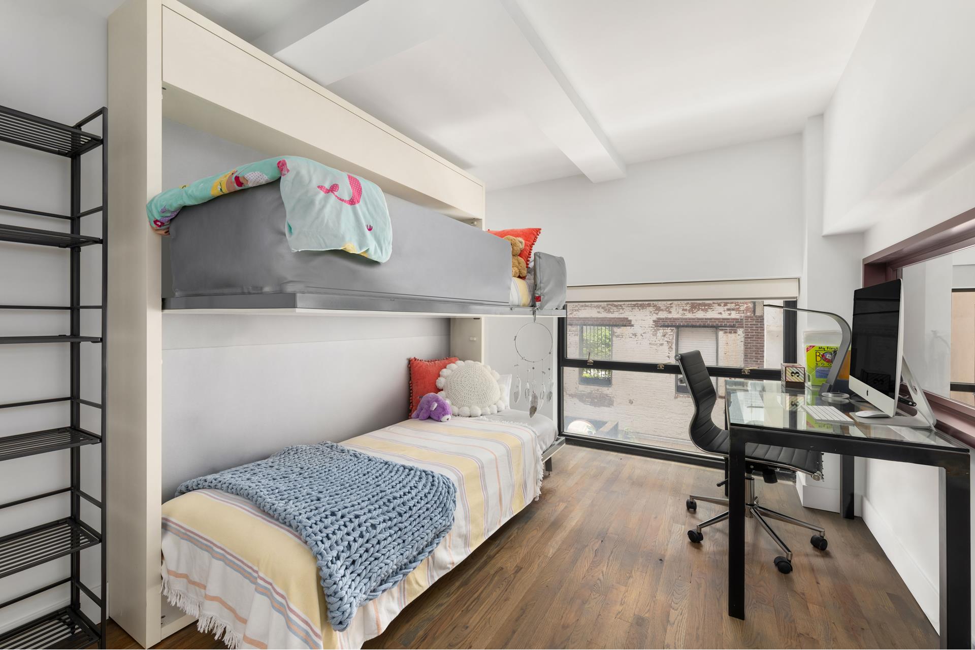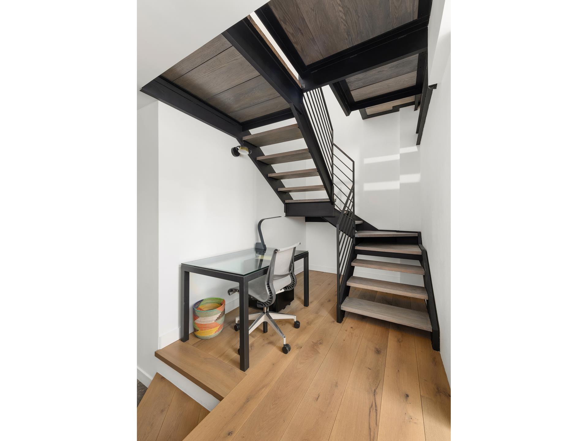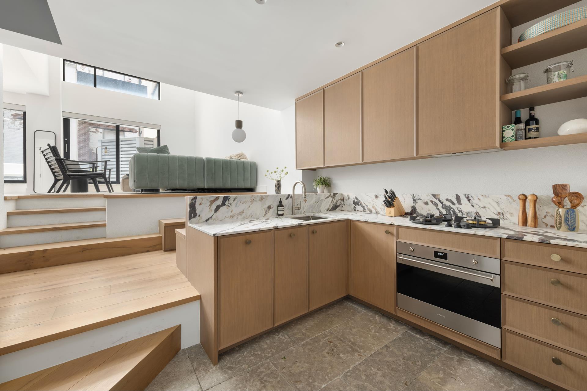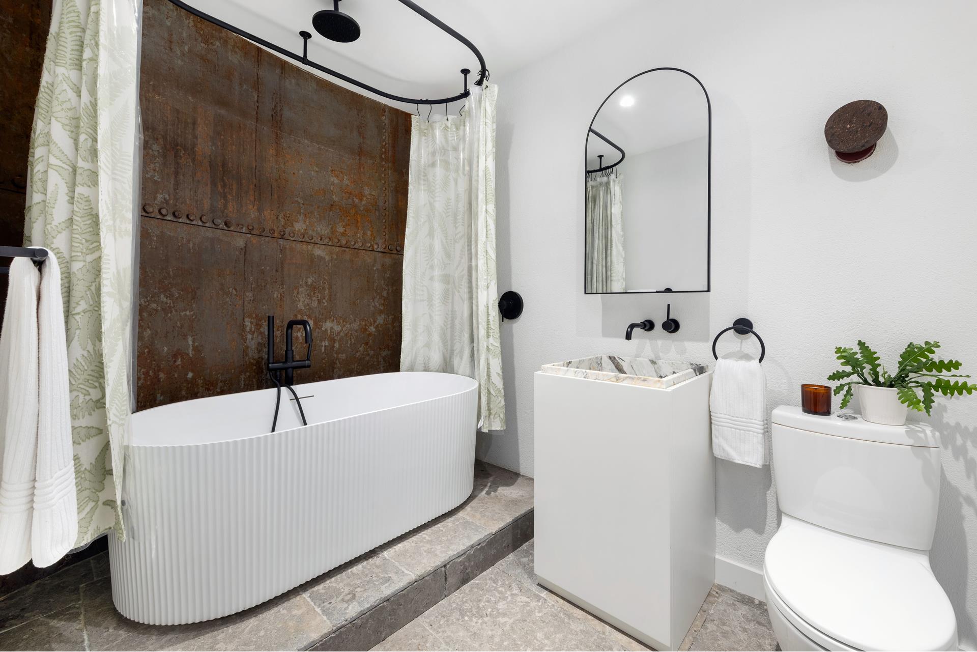 Moving up the floating staircase, the primary bedroom comes equipped with a large walk in closet and a massive bathroom, which is like a sanctuary of its own, featuring hand-painted Zellige tiles, brass fixtures, and a custom cast concrete double vanity. Perfect for guests or family, the second bedroom comes equipped with luxury custom murphy bunk beds from Resource Furniture-designed for comfort and intelligent space-saving. The downstairs guest bathroom is outfitted with limestone floors, a soaking tub with a rain shower, and an Italian marble vanity. The unit also comes equipped with an in unit washer/dryer and a large deeded storage unit.