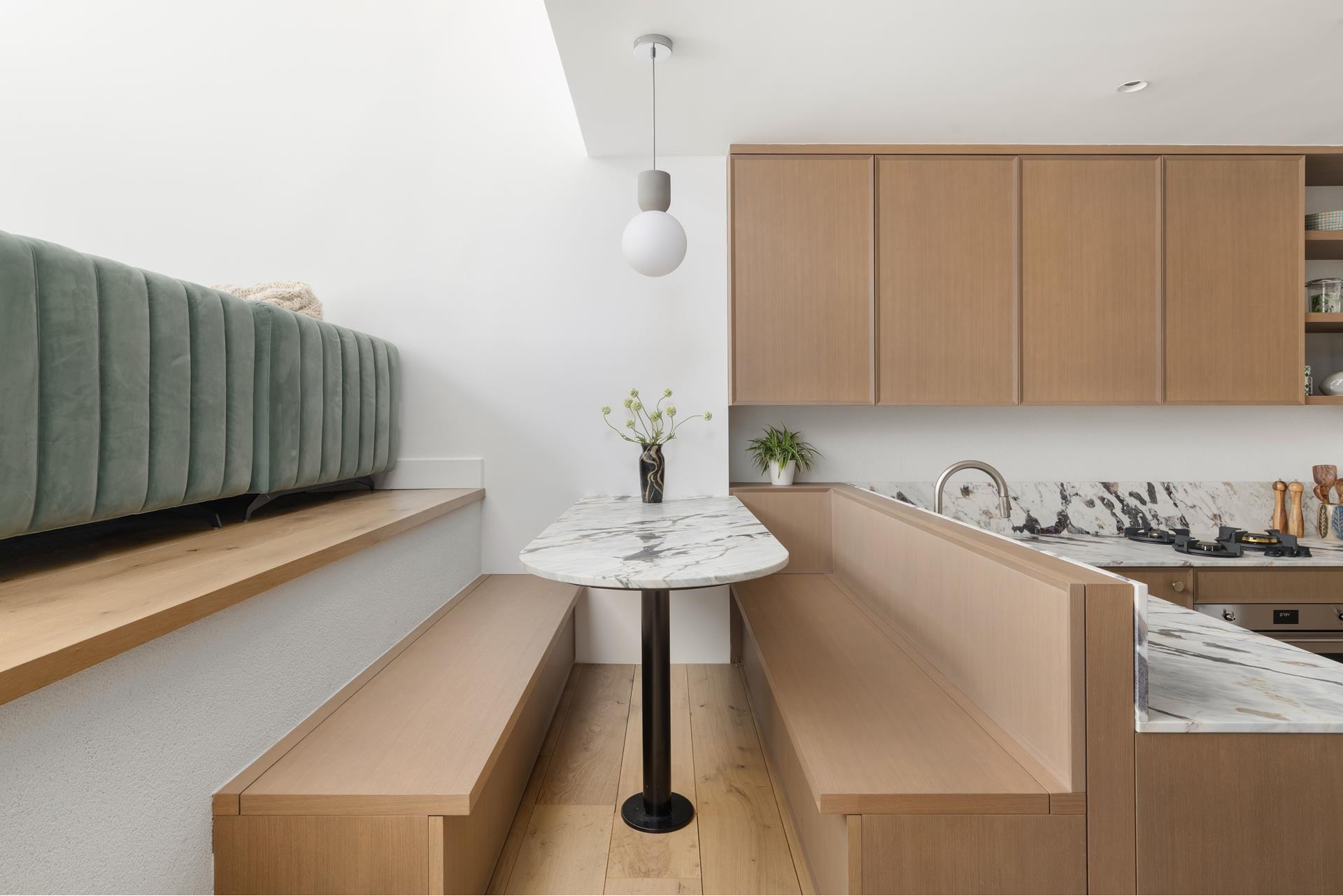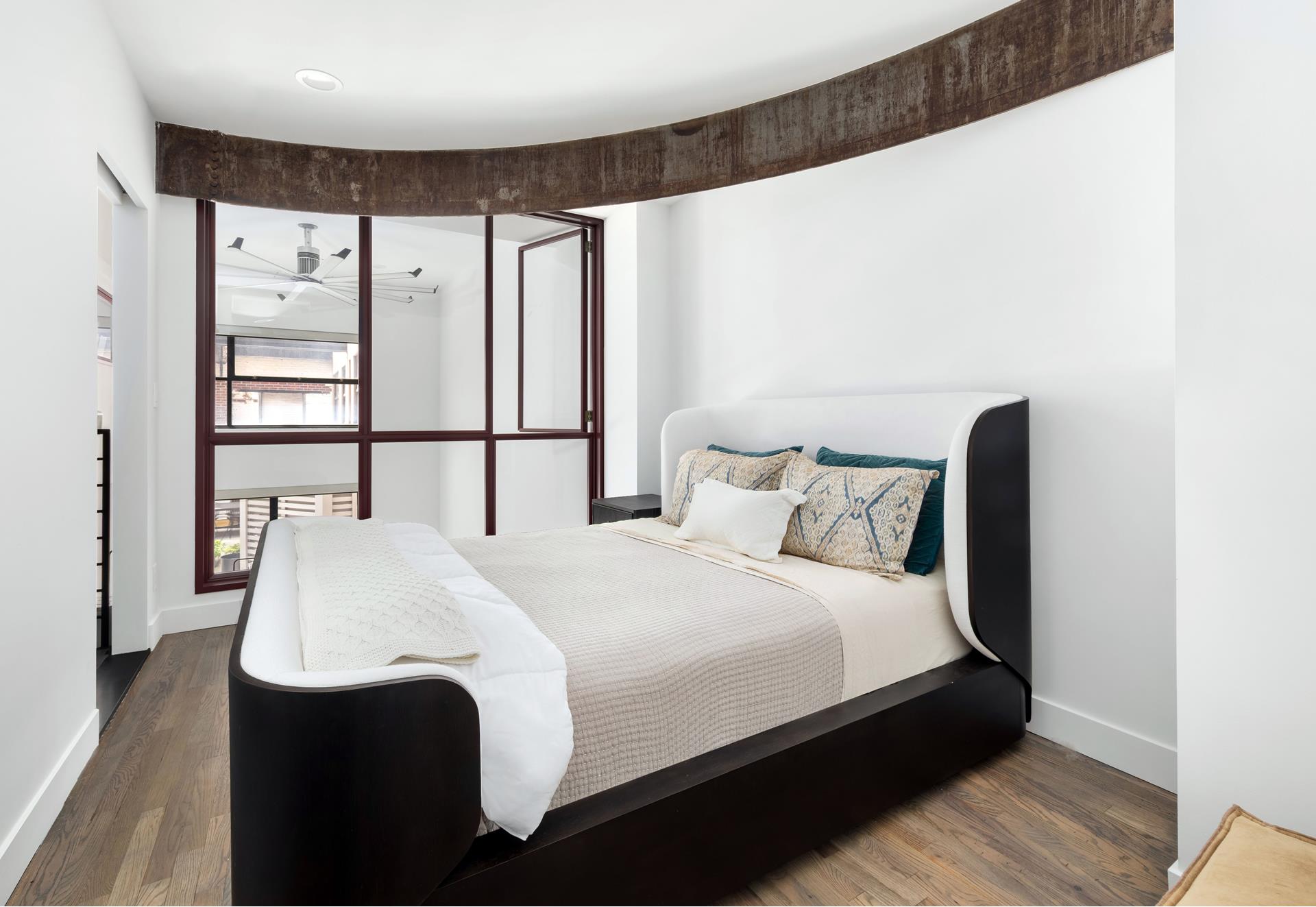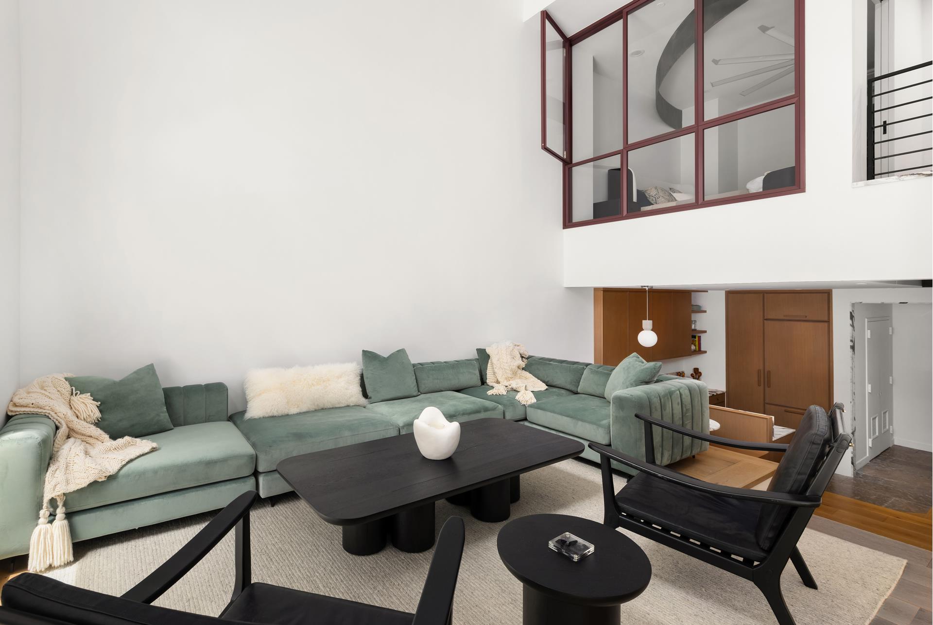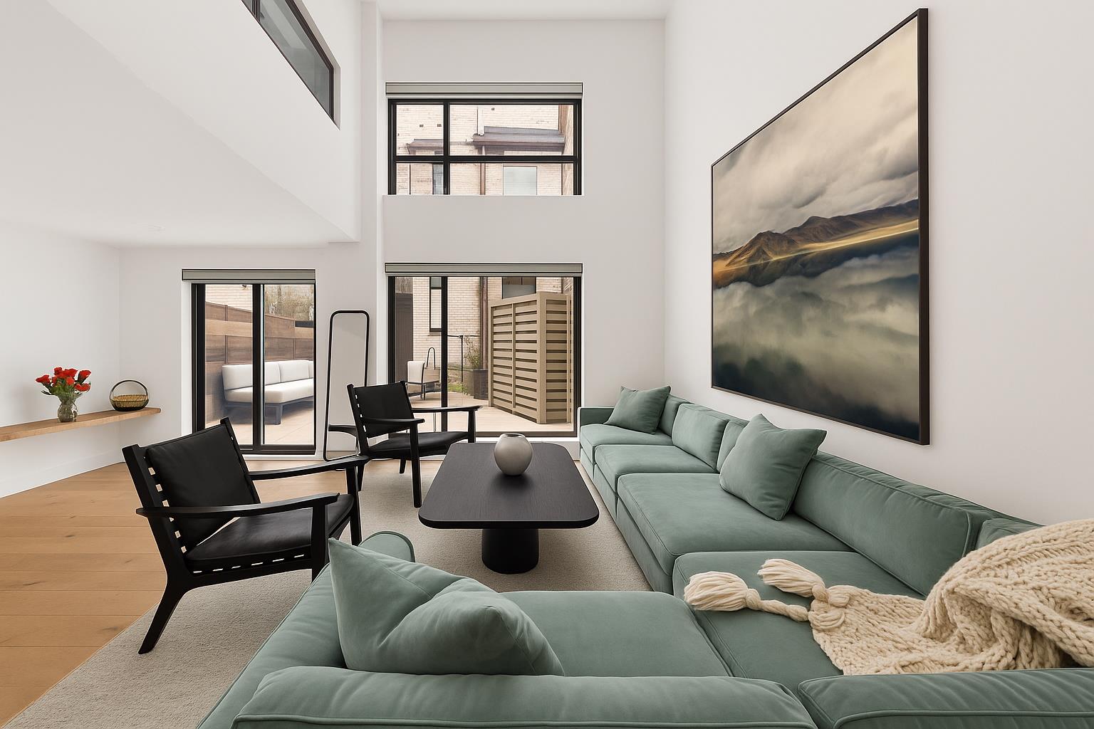The chef's kitchen features limestone floors, brand new appliances, custom solid white oak cabinetry with bespoke pulls and brass accents, complemented by Italian Breccia Capraia Marble countertops and backsplash. A built-in dining banquette seamlessly integrates form and function, while brand-new appliances make this kitchen as practical as it is beautiful. The dramatic double-height ceilings in the living room create an airy and expansive feel with direct access to a large private outdoor space, making this loft ideal for both entertaining and relaxing. A third bedroom could easily be created in this space and an alternate floor plan is enclosed for design inspiration. French white oak floors run throughout, enhanced by Italian marble accents, custom interior windows, and automatic Hunter Douglas blackout shades, creating a serene, light-filled environment with an elevated finish.
