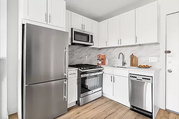 Apartment 5F at 109 Montague Street is a south-facing 2-bedroom, 2-bathroom home that has undergone a complete renovation and modernization. The open living and dining area features an L-shaped kitchen equipped with full sized stainless steel appliances, white shaker cabinetry, and white Caesarstone countertops. This flexible space features two south-facing windows and a historic decorative fireplace as focal points, and can be arranged to include a dining area and living area.