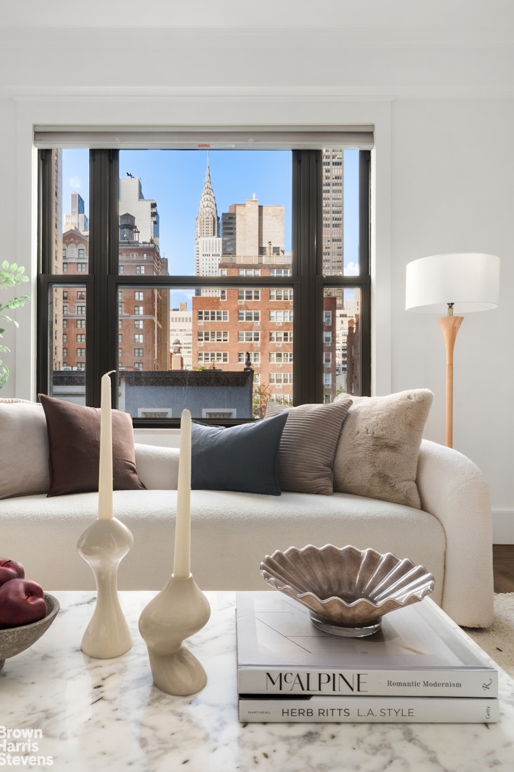 Originally built in 1916, this boutique cooperative retains its classic architectural character with grand arches, soaring 9.5-foot beamed ceilings, oversized windows, a decorative fireplace, and solid oak floors. The apartment's gracious proportions and multiple exposures flood the home with natural light while offering protected views of city icons including the Chrysler Building and the landmarked townhouses of Sniffen Court.