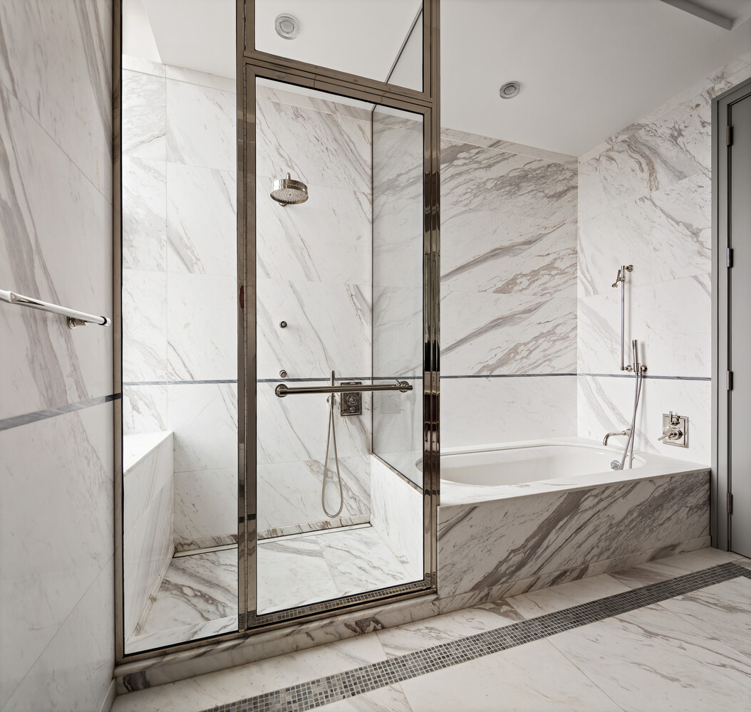 The primary suite enjoys iconic views of the Statue of Liberty and Manhattan skyline, along with a spa-like five-fixture bath clad in marble. Radiant heated floors, a custom oak vanity, a marble-framed tub, and a windowed shower create an atmosphere of understated luxury. Each secondary bedroom includes its own en-suite bath, while the powder room is finished with marble mosaic floors and a Waterworks vanity.