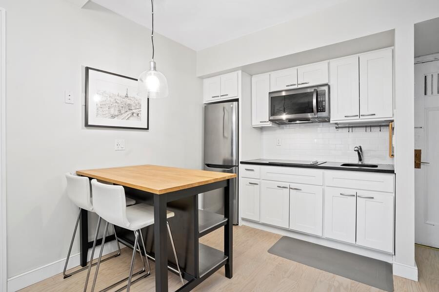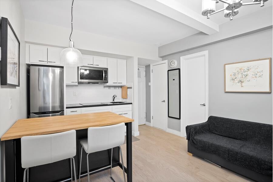 This beautifully renovated designer studio is a turnkey gem, marrying timeless charm with contemporary convenience, with meticulous attention to every detail and expense spared. Look inside to a chef's kitchen that gleams with stainless steel appliances, granite countertops, and custom cabinets that balance beauty with practicality. Thoughtful touches abound-from built-ins and custom closets to a refreshed tile bath-complemented by warm hardwood floors for an effortlessly polished feel. Bright, southern exposure windows flood the space with natural light, keeping the home welcoming, peaceful, and comfy year-round.