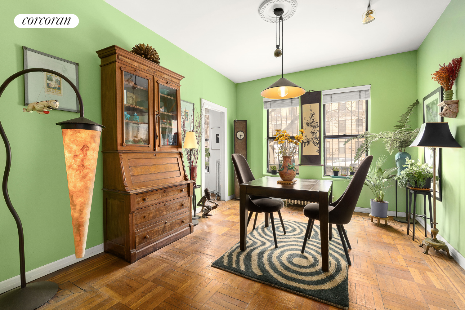 History, Character and Charm greet you as you enter 69 Tiemann Place! This home is a gracious split two bedroom layout and is conveniently located on the first floor tucked away in the corner with its own entrance hall. After you enter the front door of the apartment, to your right you will find the large primary bedroom with a West facing window. As you continue down the entry hall you will find the full bathroom also with a West facing window, followed by the renovated, windowed chef inspired kitchen with a Vilking stove and oven, LG dishwasher Liebherr refrigerator. Then you access the rather large living room with a West facing bay window, open to the formal dining room which has South facing windows. The dining room could easily be a third bedroom. Lastly you will find a charming second bedroom also with South facing windows. This home is gracious in size with high 9'10" ceilings, prewar details and original hardwood floors throughout with lovely inlay and border details. The Southern and Western exposures provide nice light through most of the day. This home is a value not to be missed. This apartment can be a wonderful home or a great investment, investors welcome as you can sublet from day one.  Because the building has a strong sponsor presence, without the buyer having very strong finances, bank financing is difficult.  All cash deal is preferred.