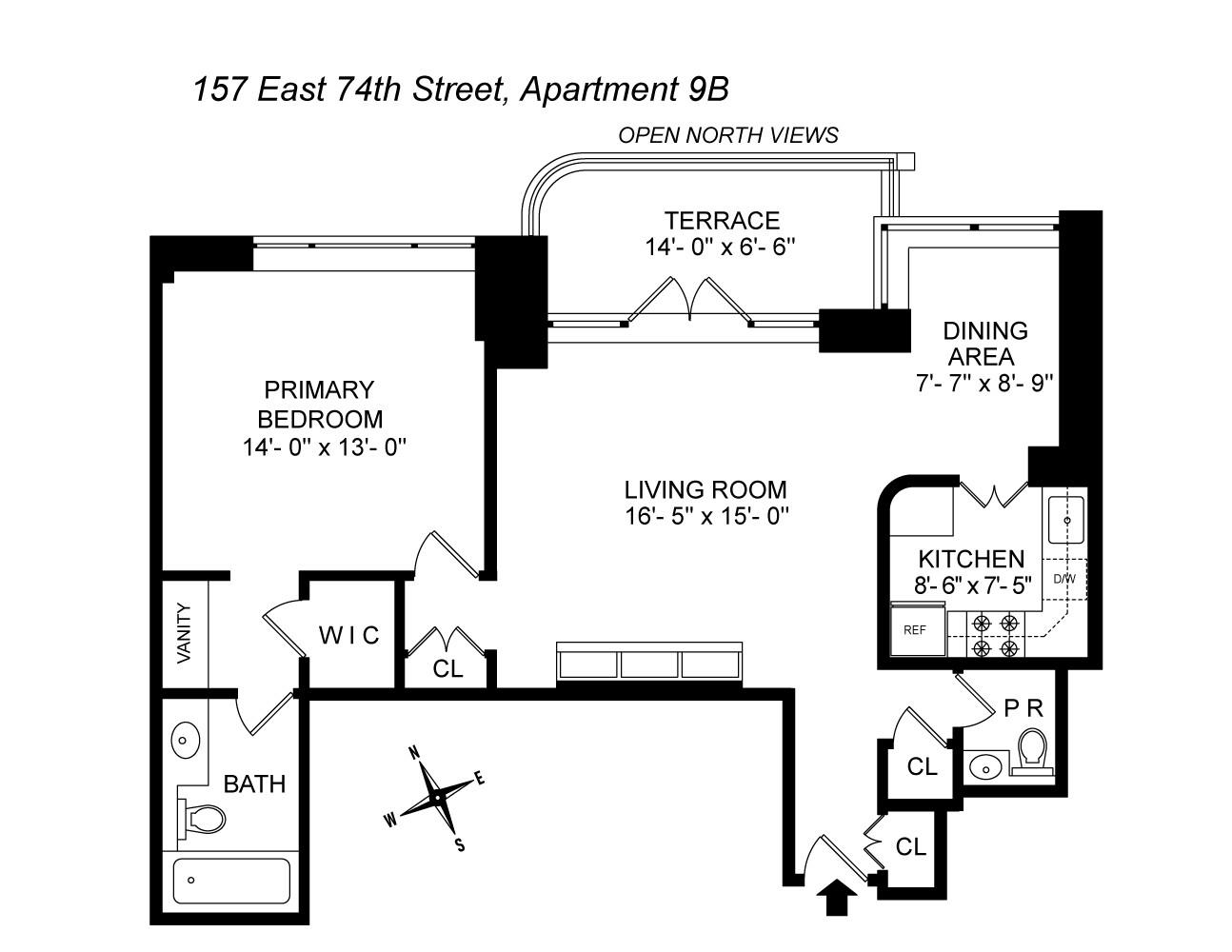 Bring your designer/architect to this exceptional one bedroom and one and a half bathroom home with a terrace floating in the sky at the Saga House, a boutique fulltime doorman condominium on one of the Upper East Side's prettiest tree-lined townhouse streets. Each room has open north views through large picture windows over elegant townhouses on east 75th street which floods the apartment with light. The large terrace off the living room and separate dining area off the kitchen make this one of the best one bedroom floorplans on the market.