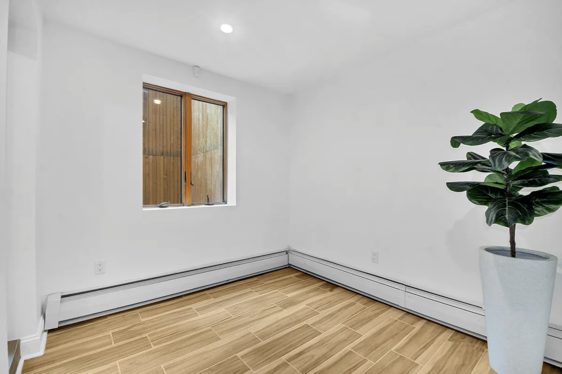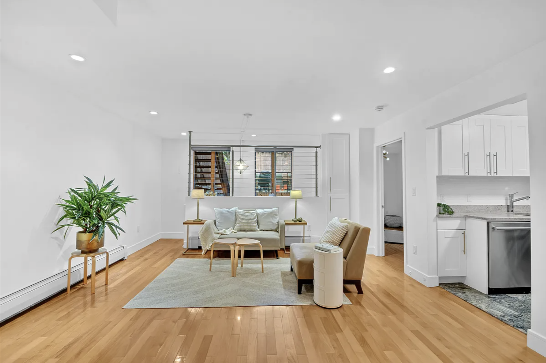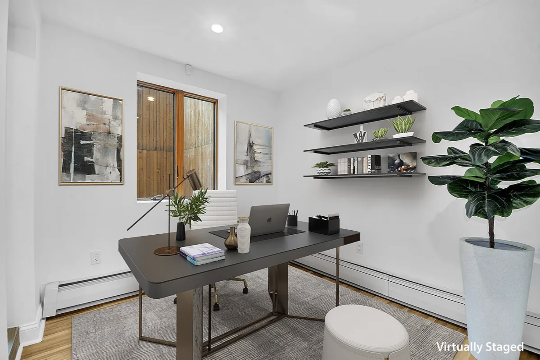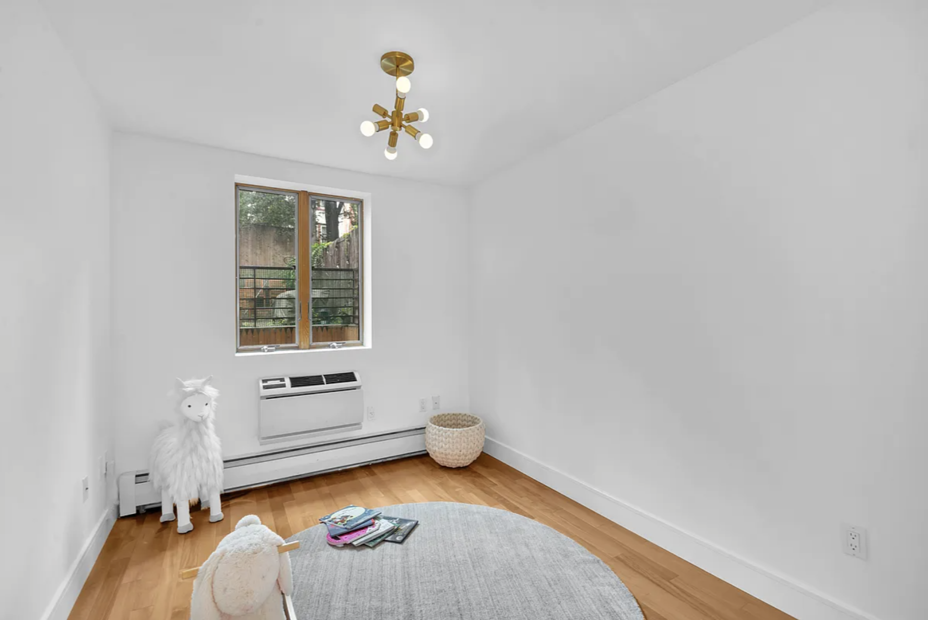 Downstairs, you’ll find a spacious sleeping area with a wall of custom closets, another full bath, private laundry, and direct access to the garden. (Per the offering plan, it’s legally a one-bedroom.) A second room overlooking the outdoor space makes for an ideal home office, guest room, or creative studio.