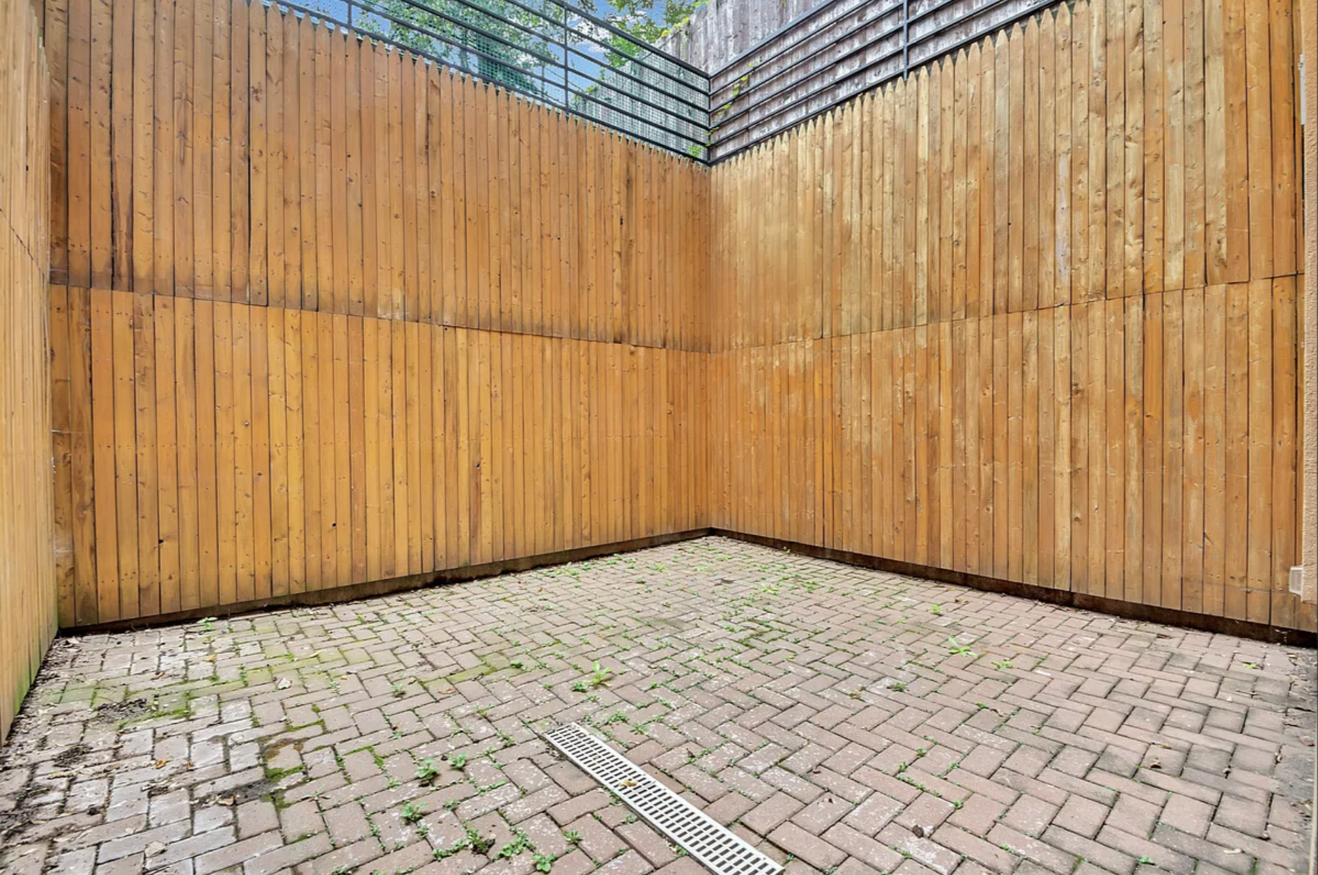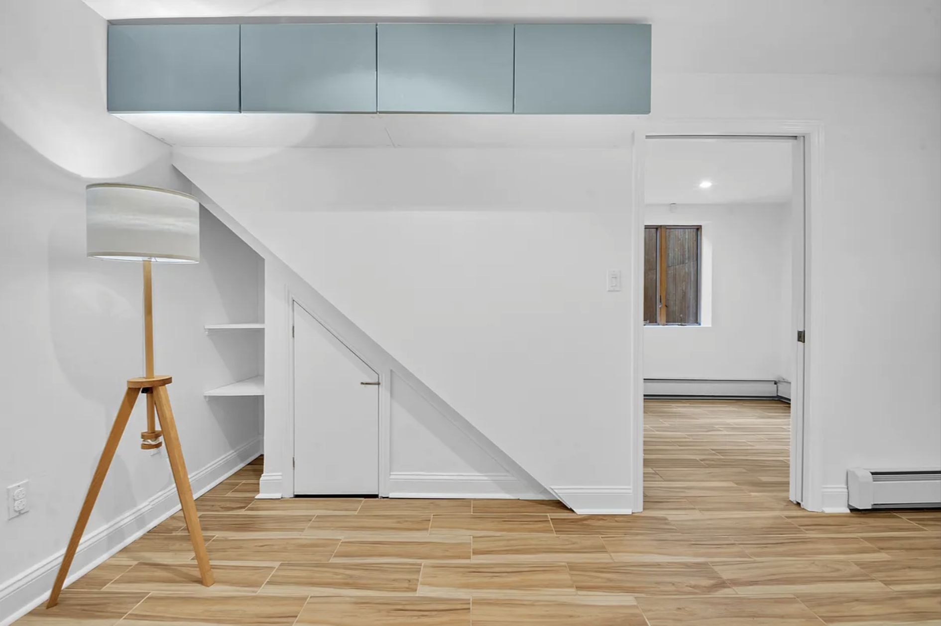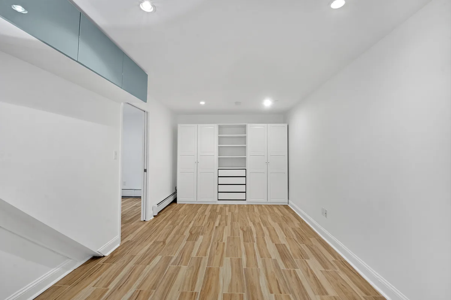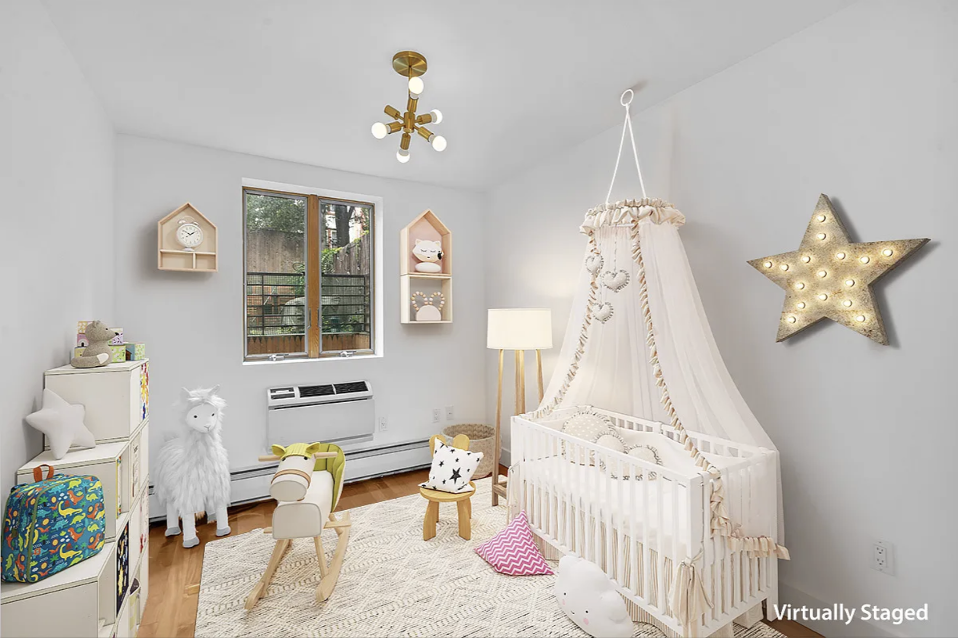 Downstairs, you’ll find a spacious sleeping area with a wall of custom closets, another full bath, private laundry, and direct access to the garden. (Per the offering plan, it’s legally a one-bedroom.) A second room overlooking the outdoor space makes for an ideal home office, guest room, or creative studio.