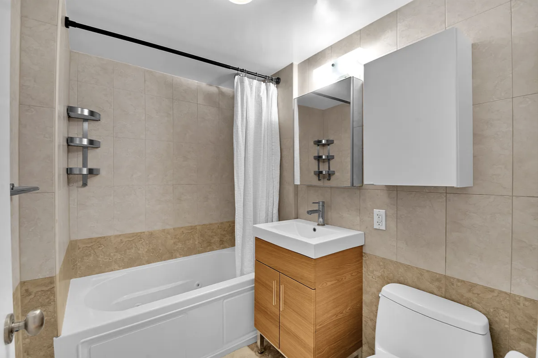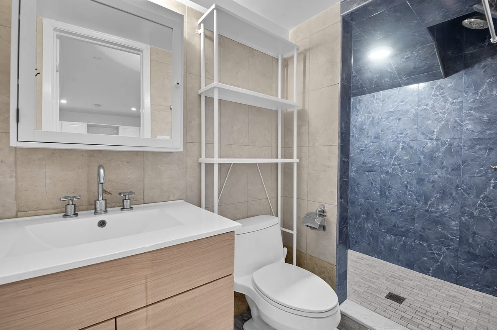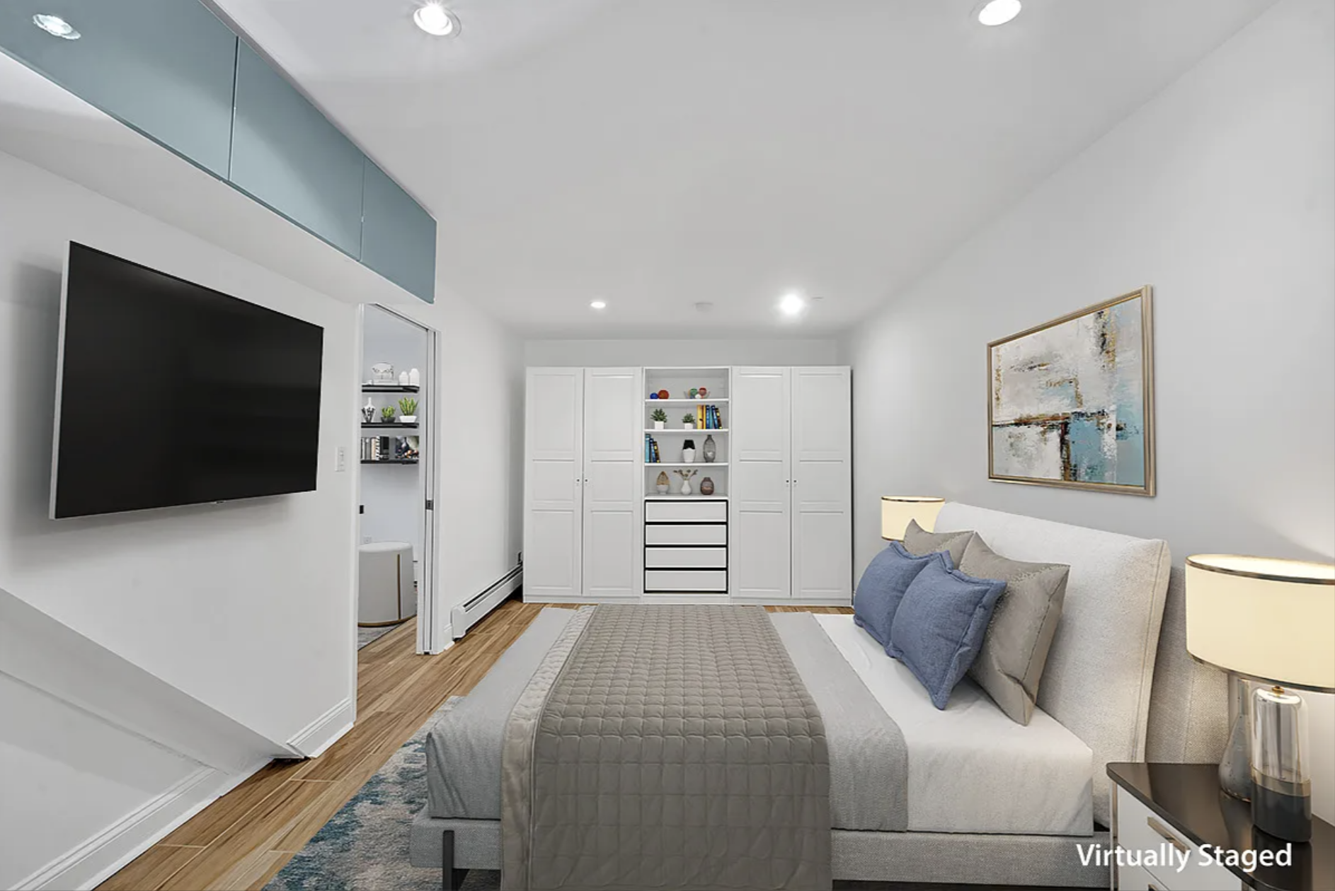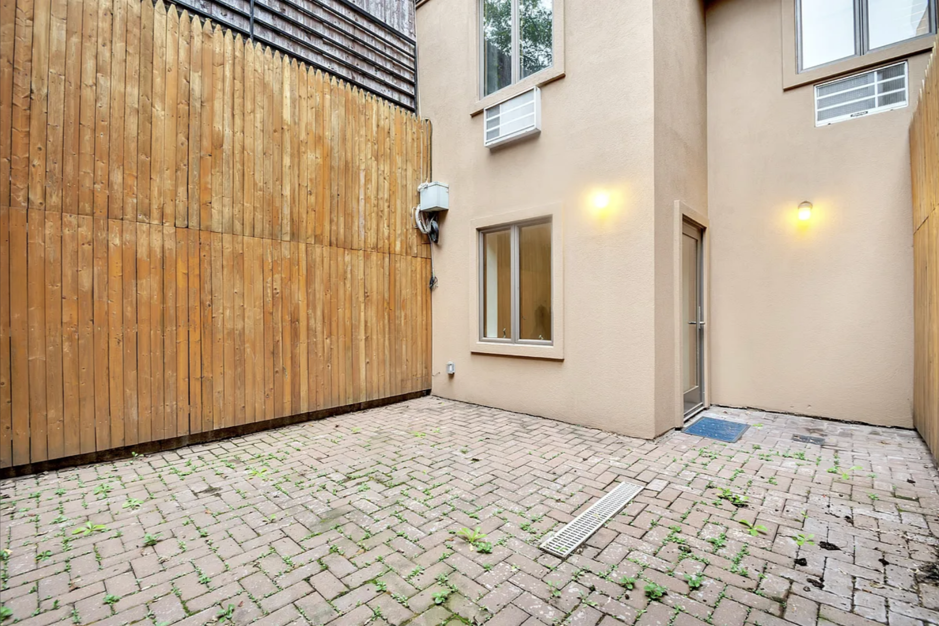 Downstairs, you’ll find a spacious sleeping area with a wall of custom closets, another full bath, private laundry, and direct access to the garden. (Per the offering plan, it’s legally a one-bedroom.) A second room overlooking the outdoor space makes for an ideal home office, guest room, or creative studio.